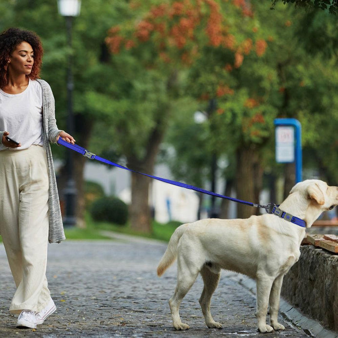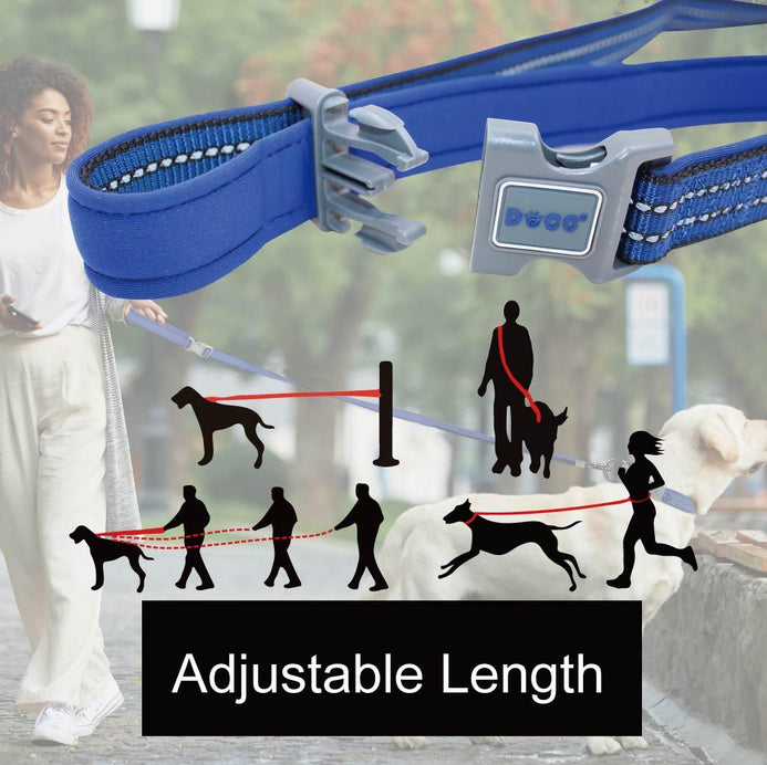 Open the release buckle on the handle and slide all the way down to shorten the leash and easy-snap them back. This will adjust the length of the leash to keep your buddy closer in high traffic areas or cross walks. Also keeps your buddy secure in the back seat of the car. Simply slide the buckle up to its original position to make it longer.