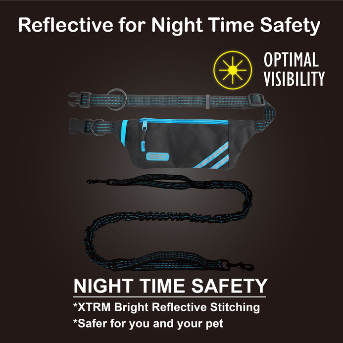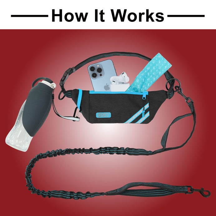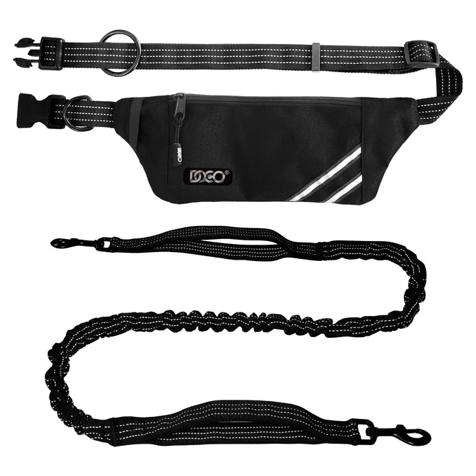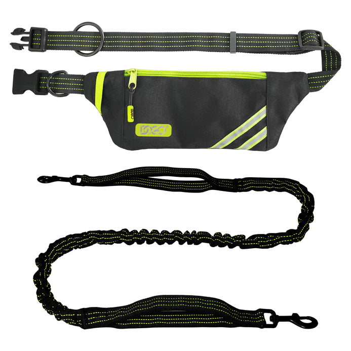 The DOCO® Jogging Belt + Bungee Leash boasts a durable Oxford polyester shell that ensures both longevity and comfort. The movable O-Ring allows your dog to roam freely while attached. The belt features spacious pockets designed to hold your mobile phone and wipes, while the nylon strap conveniently holds poop bags and keys. Reflective elements are integrated throughout the jogging belt for enhanced visibility. The leash comes equipped with two robust snap hooks for easy attachment to both the belt and your dog's collar. Crafted with shock-absorbing bungees, the leash provides elasticity during jogging, and the reflective stitching ensures your buddy remains visible during nighttime walks.