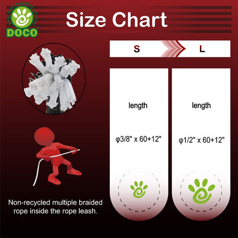 DOCO® Reflective Rope Slip Leash w/Black Nylon Handle is functional and stylish rope dog collar and leash set. Features a limited slip adjusting silicone slider. Fitted with black metal accessories and heavy duty polyester braid shell with a cushioned core. Made for active, outdoor dogs, but soft enough for smal or indoor dogs. Reflective stitch ensure the safety during night time walking. Rounded surface prevents matting. Heavy Duty Welded Metal O-Ring and tri-glide ensure durable quality. Easy to slip on and off, combo set allows ease of use.