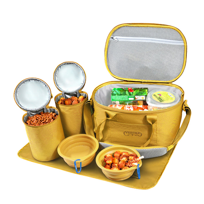 effort. The top of the cooler bag can accommodate silicone tableware and waterproof placemats, while the bottom pocket is perfect for food and water. The front pocket is ideal for storing keys and small items, and the side pocket can hold poop bags. The cooler bag features custom premium metal hardware that is strong and durable, with a smooth metal two-way zipper for easy access. The top handle of the insulated lunch bag is made of double-layer nylon material, providing both comfort and durability. For added convenience, the cooler bag comes with a detachable and adjustable shoulder strap, allowing you to use it as a handheld cooler bag or sling it over your shoulder. Additionally, two folding storage bags are included, making it easy to carry dry food or snacks for your pet.