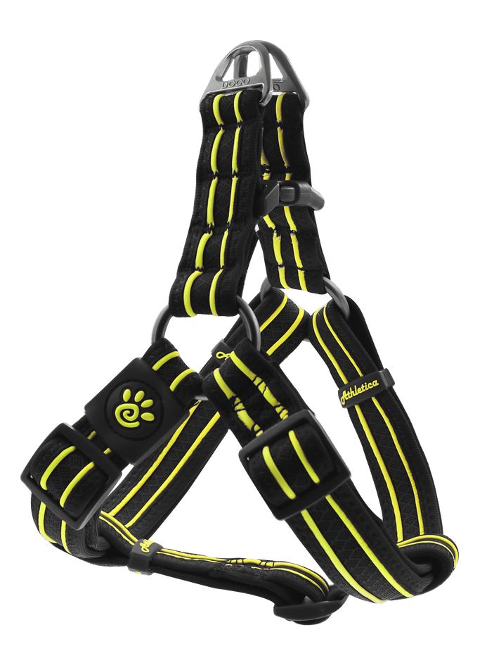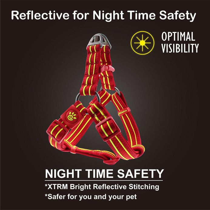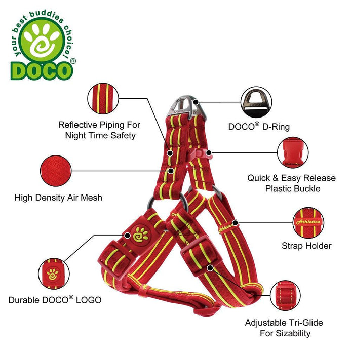 DOCO® Dual Layer Air Mesh Reflective Step-in Harness features breathable and durable high quality air mesh. This harness provides a comfort fit, total control and style between your chest. Ultra comfort, lightweight design and dual layered for higher tensile strength. Easy on and easy off, durable side release plastic buckle with adjustable tri-glide for custom fits. Heavy-duty stitching for lasting quality and fully welded metal D/O-Rings for higher tensile force. Solid and vibrant colors are easy to see. Piping has reflective stitching to ensure your buddy is safe and seen at all times. Make sure to select the matching DOCO® leashes to complete your buddies look!