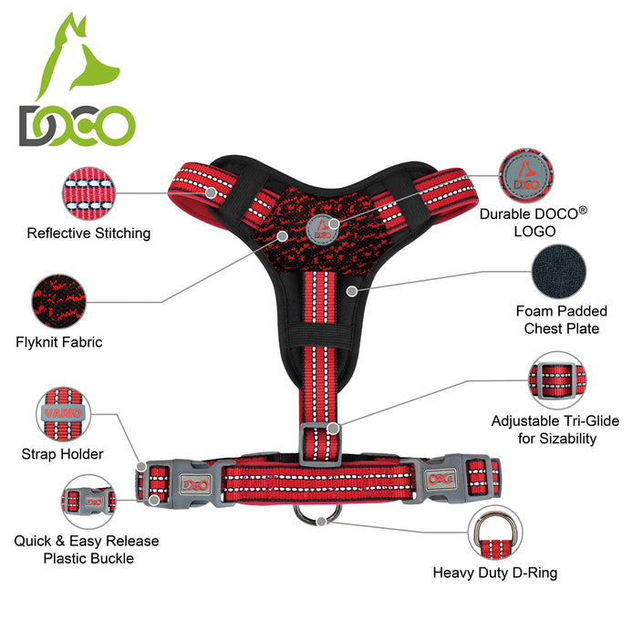 DOCO® Vario Chest Plate Harness w/Neoprene features flyknit fabric and dense padded foam interior for durability and prodction. Designed for the most comfortable and ergonomical fit with neoprene lining the harness to avoid scraping against your buddy. Easy clip on for walking and generous neoprene handle for close handling.